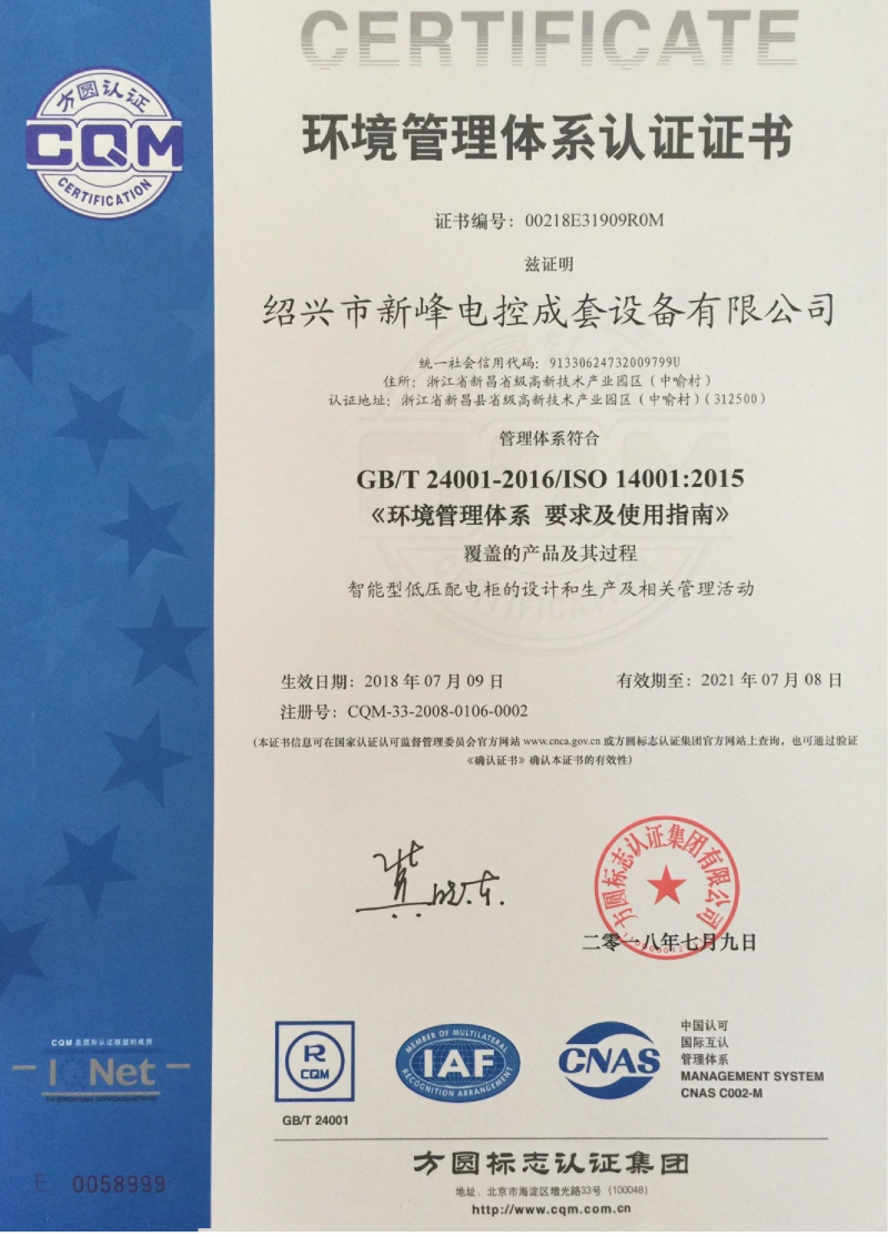 環(huán)境體系 ISO 14001:2015-公司認(rèn)證證書